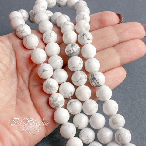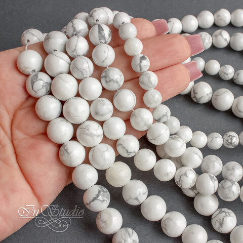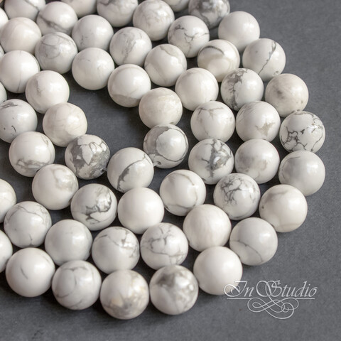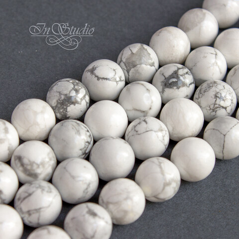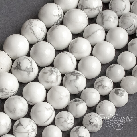 Круглые полуматовые бусины белого кахолонга с серыми прожилками