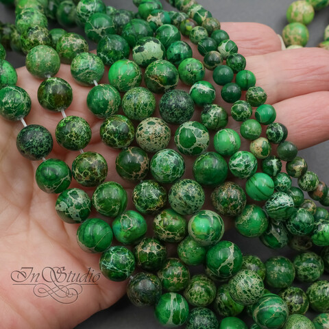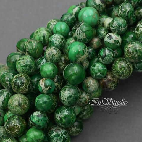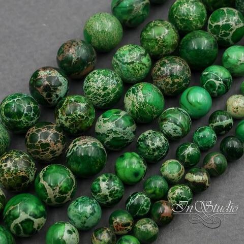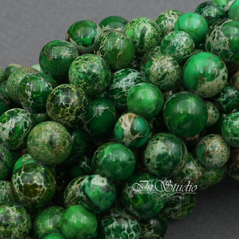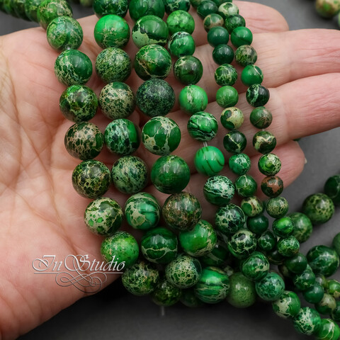Потрясающей красоты круглые бусины из натурального камня варисцит. Цветовая гамма от ярко зеленого до спокойного зеленого оттенка листвы и мха с включениями бежевых, коричневых и терракотовых оттенков. Каждая бусина имеет свой уникальный и неповторимый рисунок - узор.