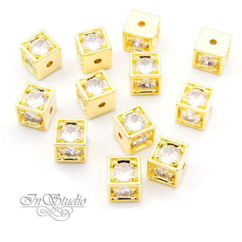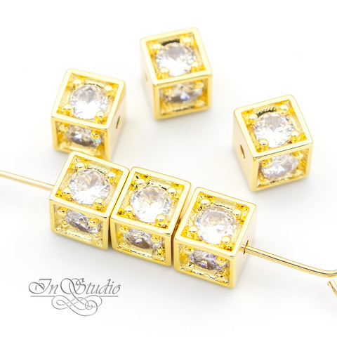 Бусина декоративная кубик позолоченная - с вставками крупных фианитов - 4 стороны с камнями и 2 стороны гладкие с отверстиями для нанизывания.