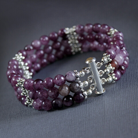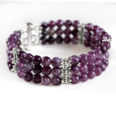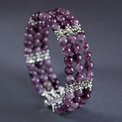 Трехрядный браслет в своей основе имеет пороволку с памятью - мемори проволоку, благодаря которой браслет из камней агата очень хорошо держит форму. Застегивается браслет на очень удобный замочек слайдер.