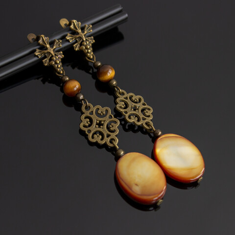 Длинные серьги из тигрового глаза с фурнитурой цвета античная бронза.