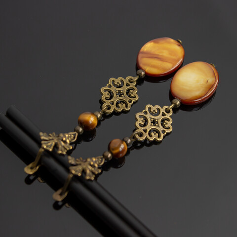 Легкие и изящные серьги в винтажном стиле с натуральным камнем медового цвета с очень эффектным переливом.