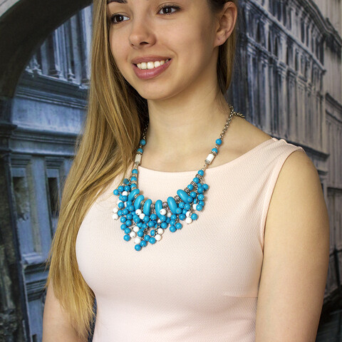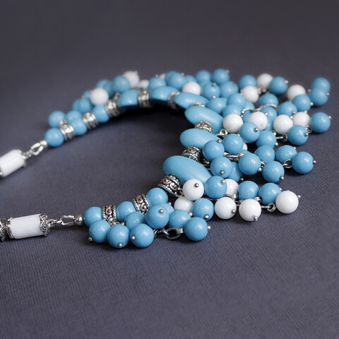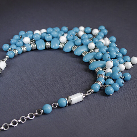 Колье Морской бриз из натурального камня кахолонга. Белоснежные бусины красиво оттеняют тонированные под бирюзу бусины кахолонга. Пышное и эффектное колье. Бусины из кахолонга шуршат и перекатываются словно морские волны.