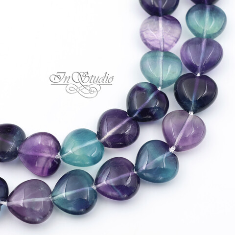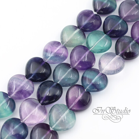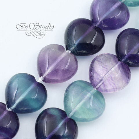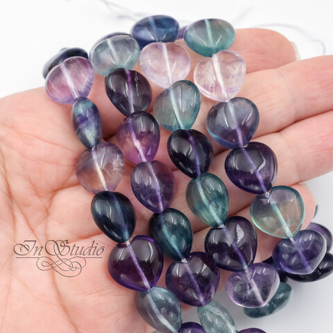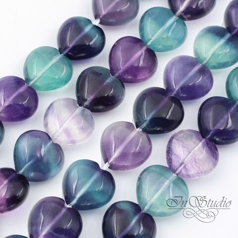 Бусины сердце из натурального флюорита - полупрозрачный камень, имеющий стеклянный блеск, разнообразной цветовой окраски: бесцветный, голубой, розовый, желтый, зеленый, фиолетовый (почти черный).