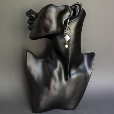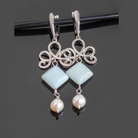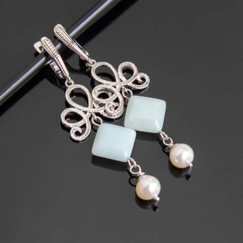 Крупные серьги с натуральным жемчугом и амазонитом.