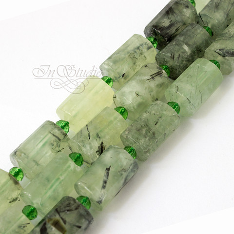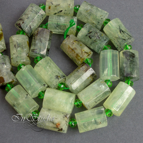 Бусины-трубочки из пренита в виде цилиндров с крупными гранями светло зеленого с черными включениями.