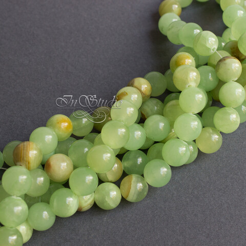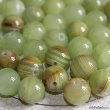 Бусины из натурального оникса светло зеленого, яблочного, салатового цвета с редкими включениями коричневого.