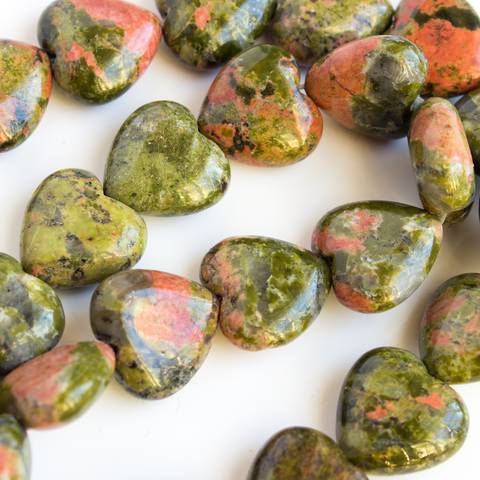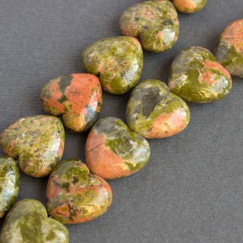 Бусины сердечки из унакита зеленого цвета со свойственными унакиту кораллово-розовыми вкраплениями.