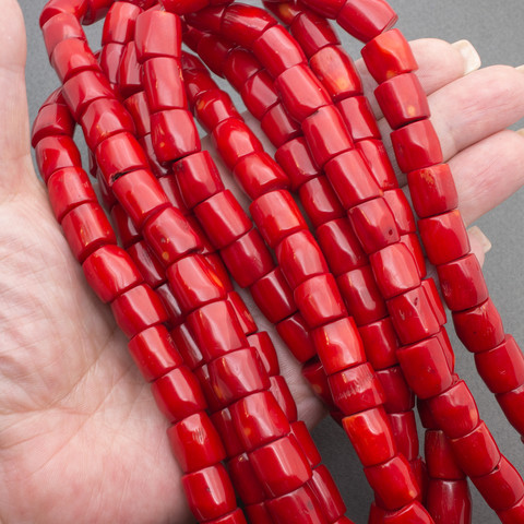 Крупные бусины продолговатой формы в виде прямоугольного бочонка натурального красного коралла для изготовления украшений - бус, браслетов, колье и серег.