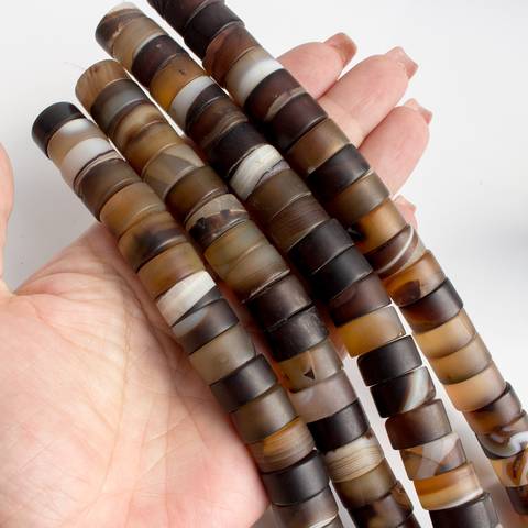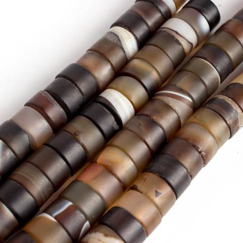 Матовые крупные бусины рондели из натурального коричневого полосатого агата. Цвет бусин от темно коричневого, шоколадного цвета до кофейного, кофе с молоком и светло бежевого оттенка.