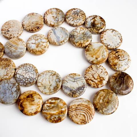 Леопардовый агат - плоские круглые крупные бусины из камня. Очень красивые бусины из агата с неповторимым рисунком. Цвет бежевый, коричневый с молочными, рыжими, серыми, желтыми цветовыми вкраплениями. Очень хорошая глянцевая полировка.