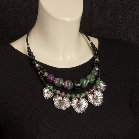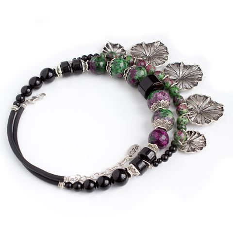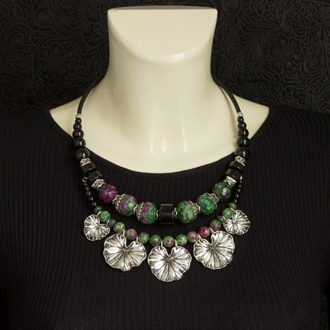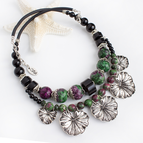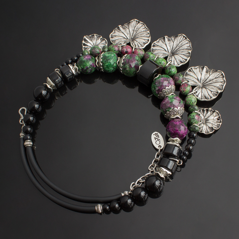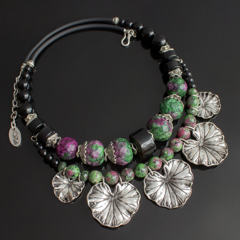 Двухрядное колье В тихом омуте из натуральных камней цоизита и черного агата. Крупное украшение на шею - контрастное сочетание черного и зеленого с вкраплениями рубина камней.