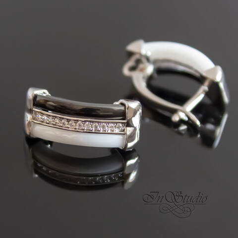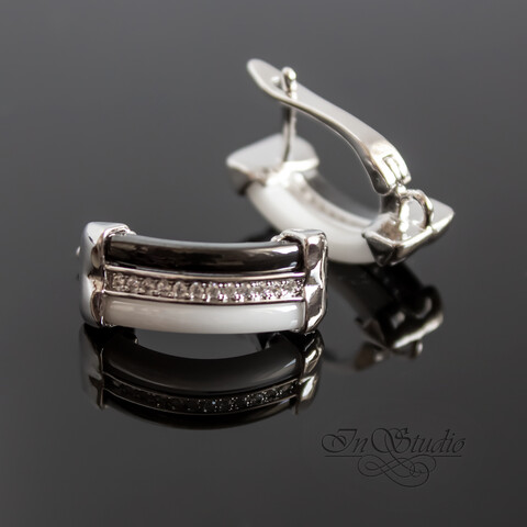 Швензы для серег Инь-Ян черно белые. Родиевое покрытие. Вставки - фианиты, черная и белая керамика.