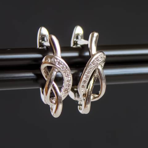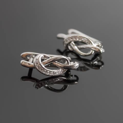 Выполнены в виде миниатюрных не полностью завязанных узелочков и инкрустированы эффектными фианитами (цирконами).