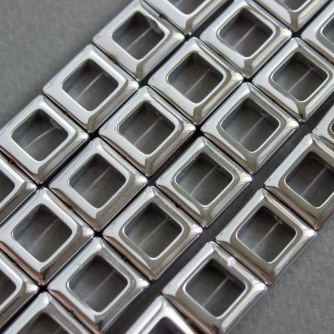 Форма минерала в виде квадратной рамки серебристого цвета с характерным металлическим блеском.