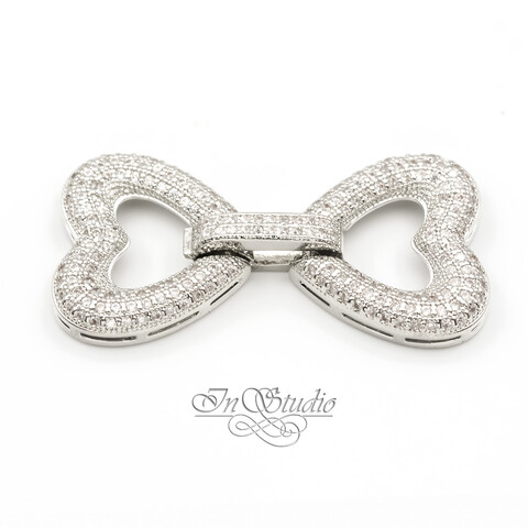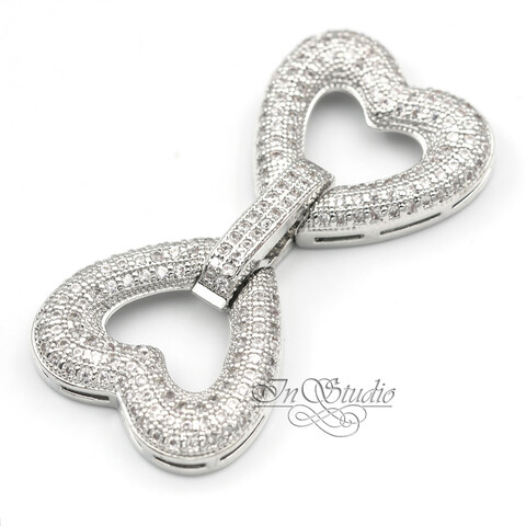 Замочек для многорядных украшений "ДВА СЕРДЦА" - родиевое покрытие, инкрустация фианитами.