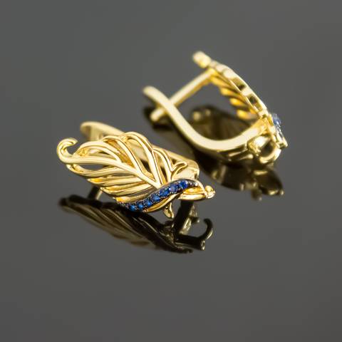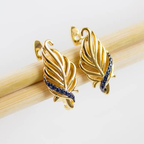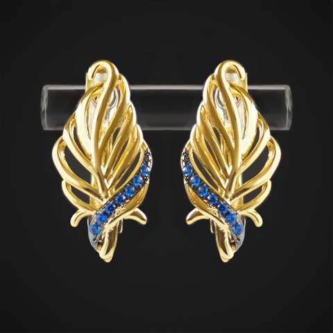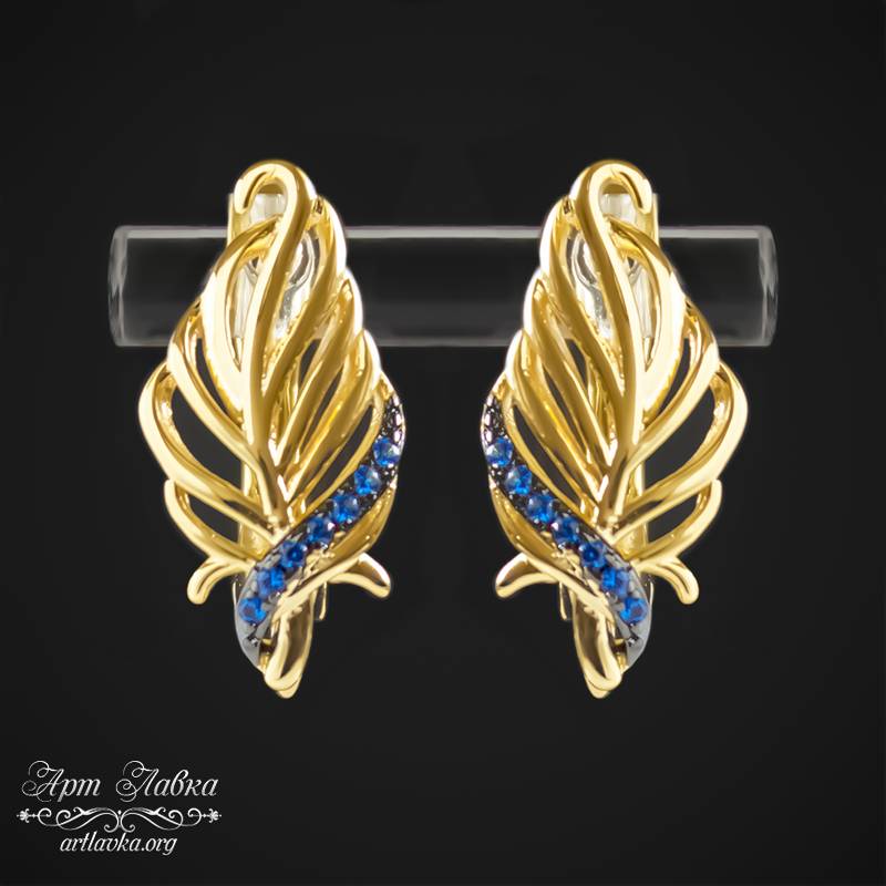 Выполнены в виде пера и украшены голубыми фианитами (цирконами).