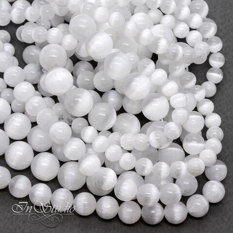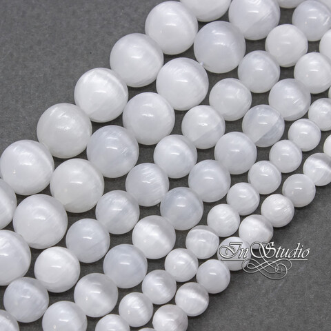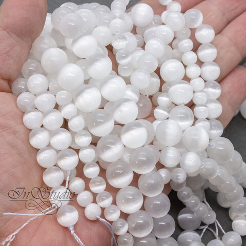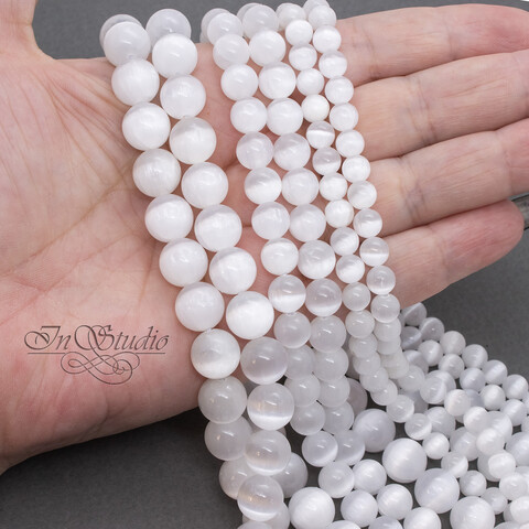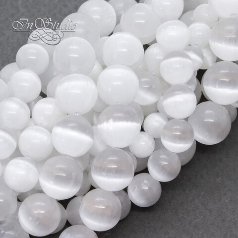 Селенит природный 6 8 10 мм белый с эффектом кошачий глаз бусины шарики