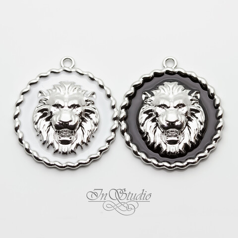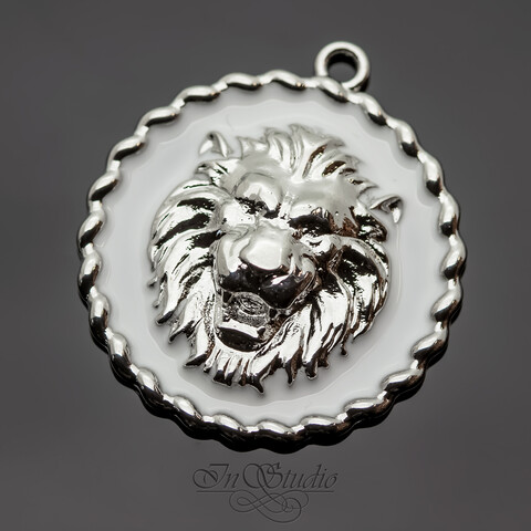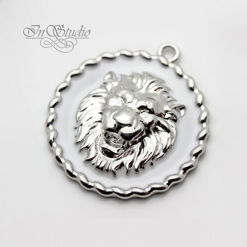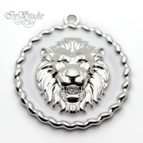 Подвеска кулон ЛЕВ 25 мм родий белая эмаль
