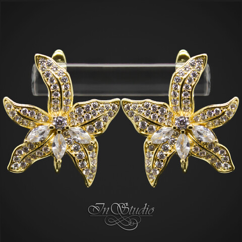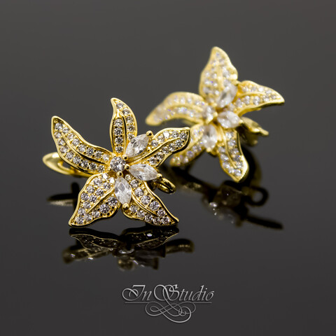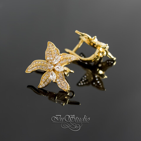 Выполнены в виде раскрывшегося цветка лилии и инкрустированные эффектными фианитами.