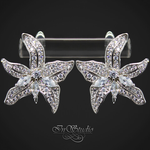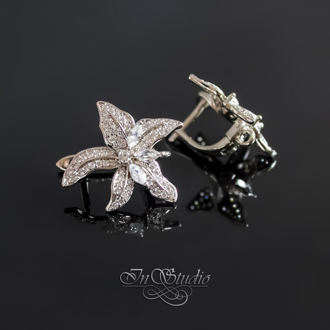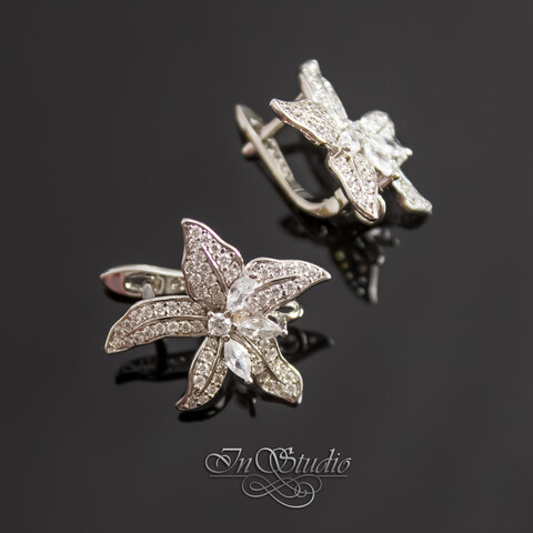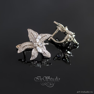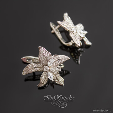 Выполнены в виде раскрывшегося цветка лилии и инкрустированные эффектными фианитами.