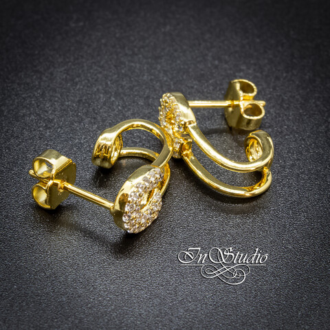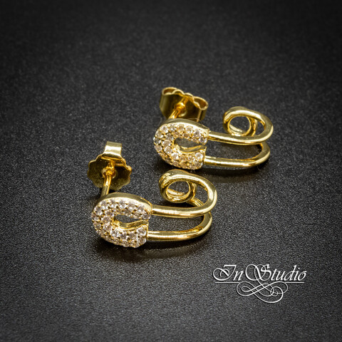 Швензы пусеты позолоченные гвоздики с фианитами в виде изогнутой английской булавки. Без петельки для подвешивания.