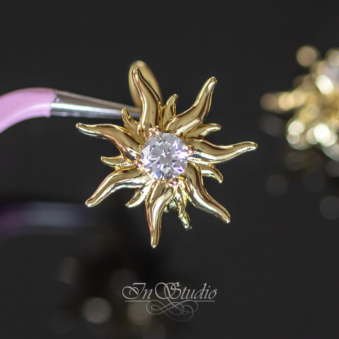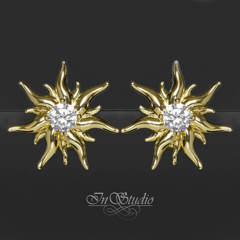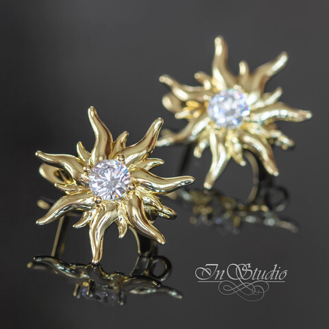 Выполнены в виде эффектных миниатюрных солнышек в центре которых крупный фианитовый кристалл.