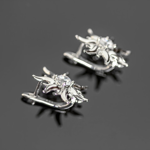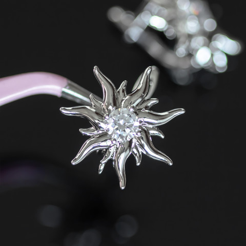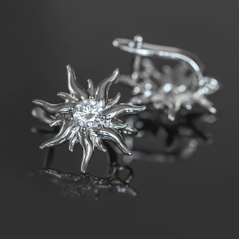 Выполнены в виде эффектных миниатюрных солнышек в центре которых крупный фианитовый кристалл.