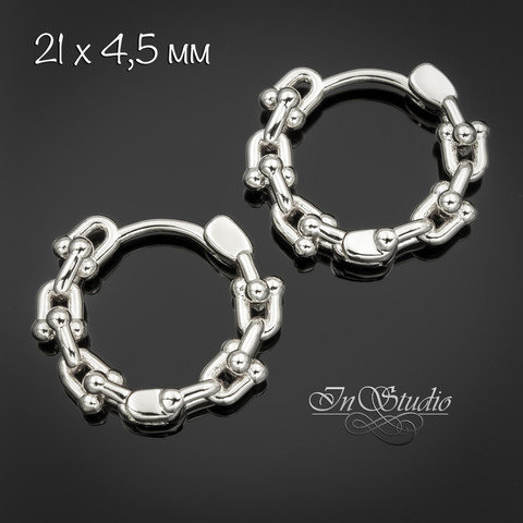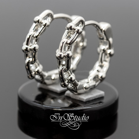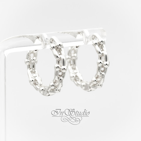 Выполнены в форме колец (бубликов) состоящих из цепочки миниатюрных подковочек.