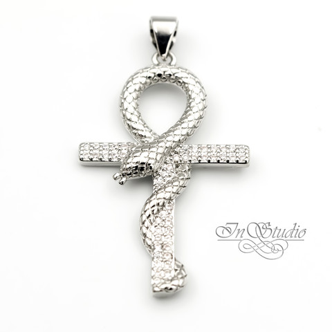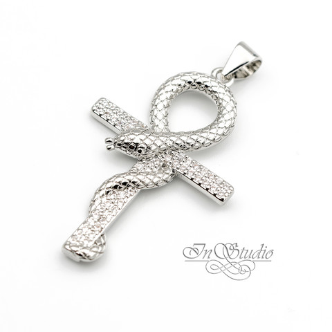 Подвеска Крест со змеёй 33х21 мм фианиты родий