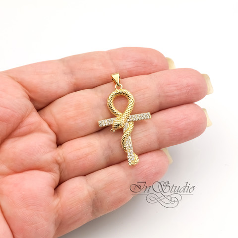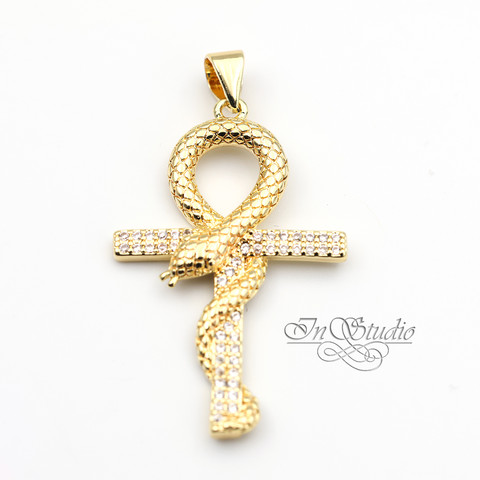 Подвеска Крест со змеёй 33х21 мм фианиты позолота