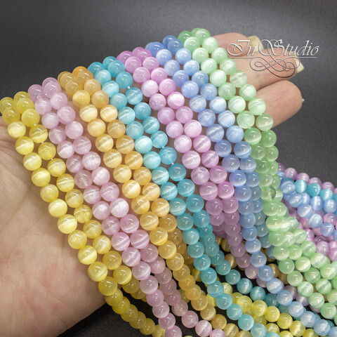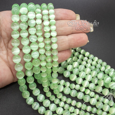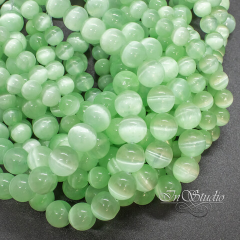 Селенит натуральный салатовый 6 8 10 мм с эффектом кошачий глаз бусины шарики