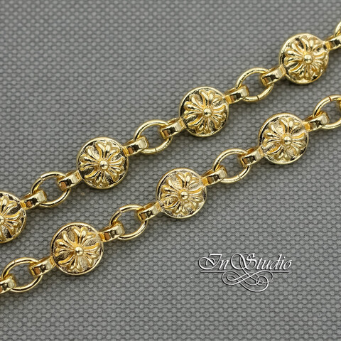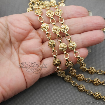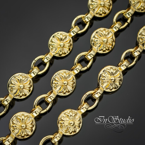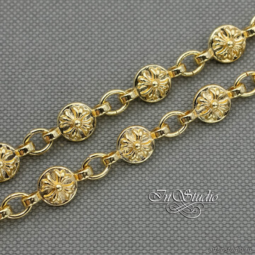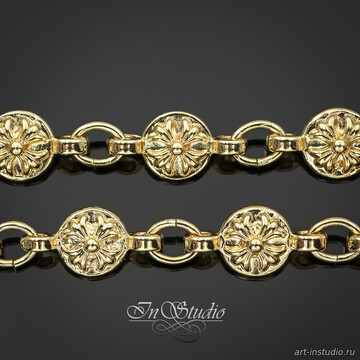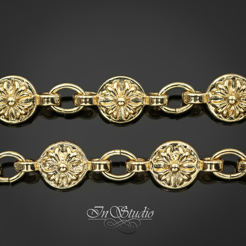 Крупные звенья-коннекторы имеют форму круглых плоских медальонов с узором.