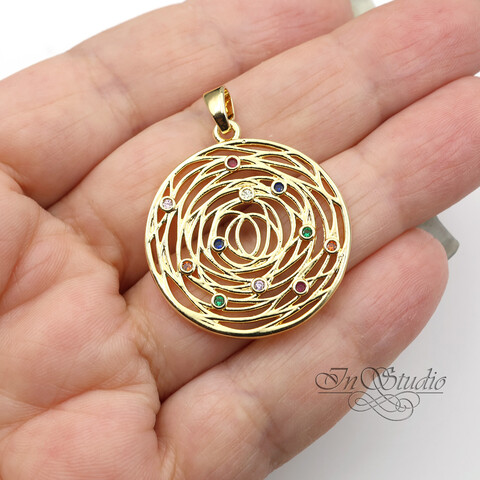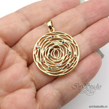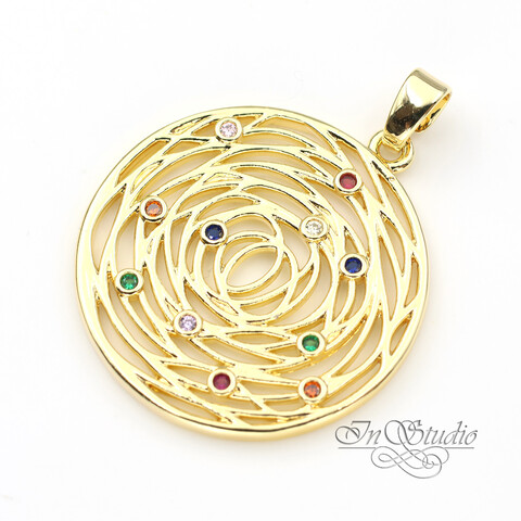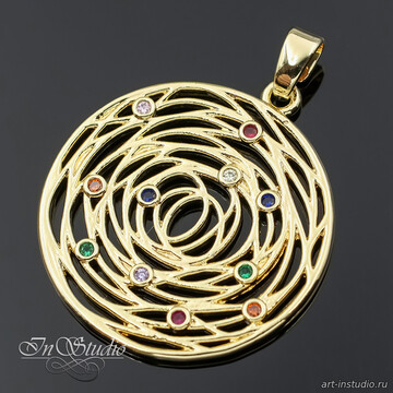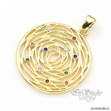 Подвеска круглая с разноцветными фианитами 29 мм позолота