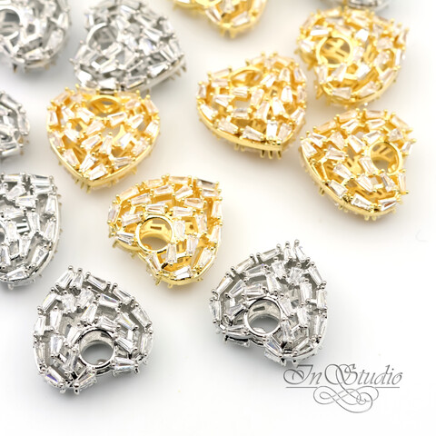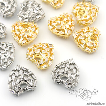 Инкрустировано множество продолговатых фианитов по всей поверхности с обоих сторон.