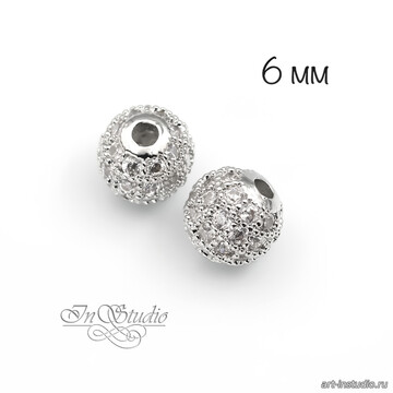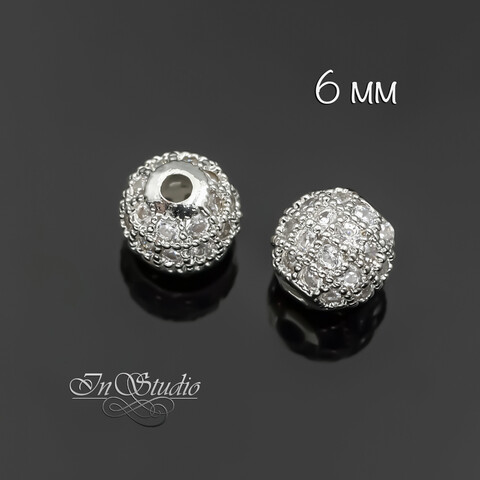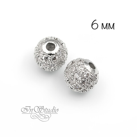 Бусина металлическая с фианитами 6 мм шар родиевое покрытие