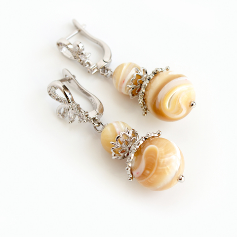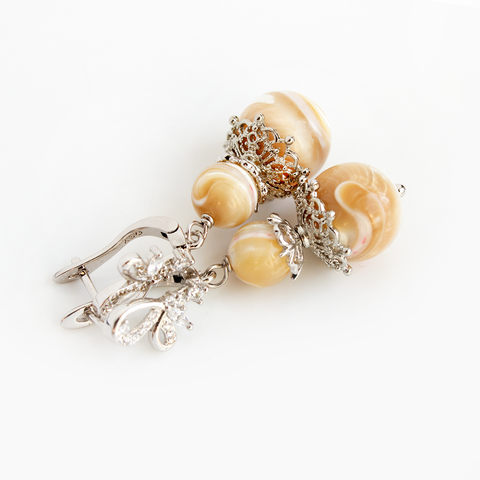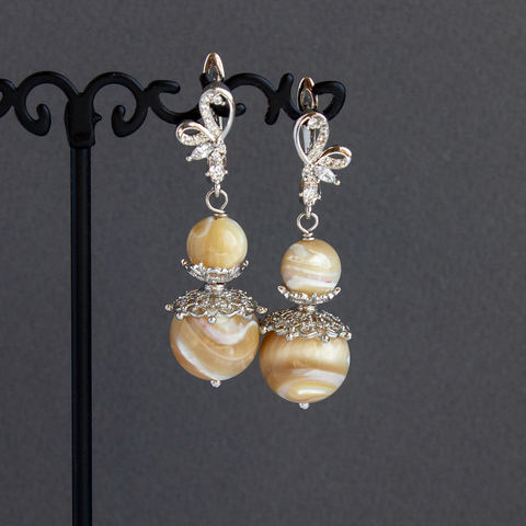 Изысканные крупные серебристые серьги Августина с натуральным перламутром сливочно-карамельного цвета.