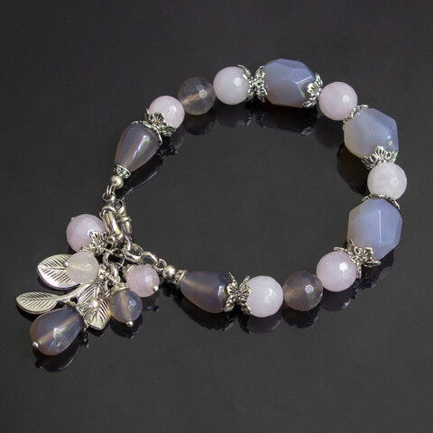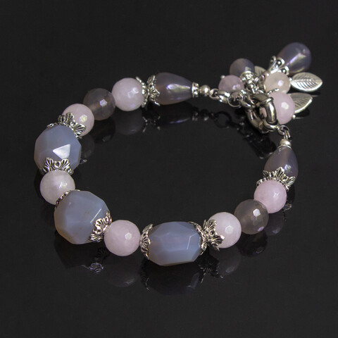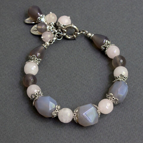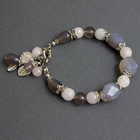 Браслет из натурального розового берилла и серого агата с подвеской.